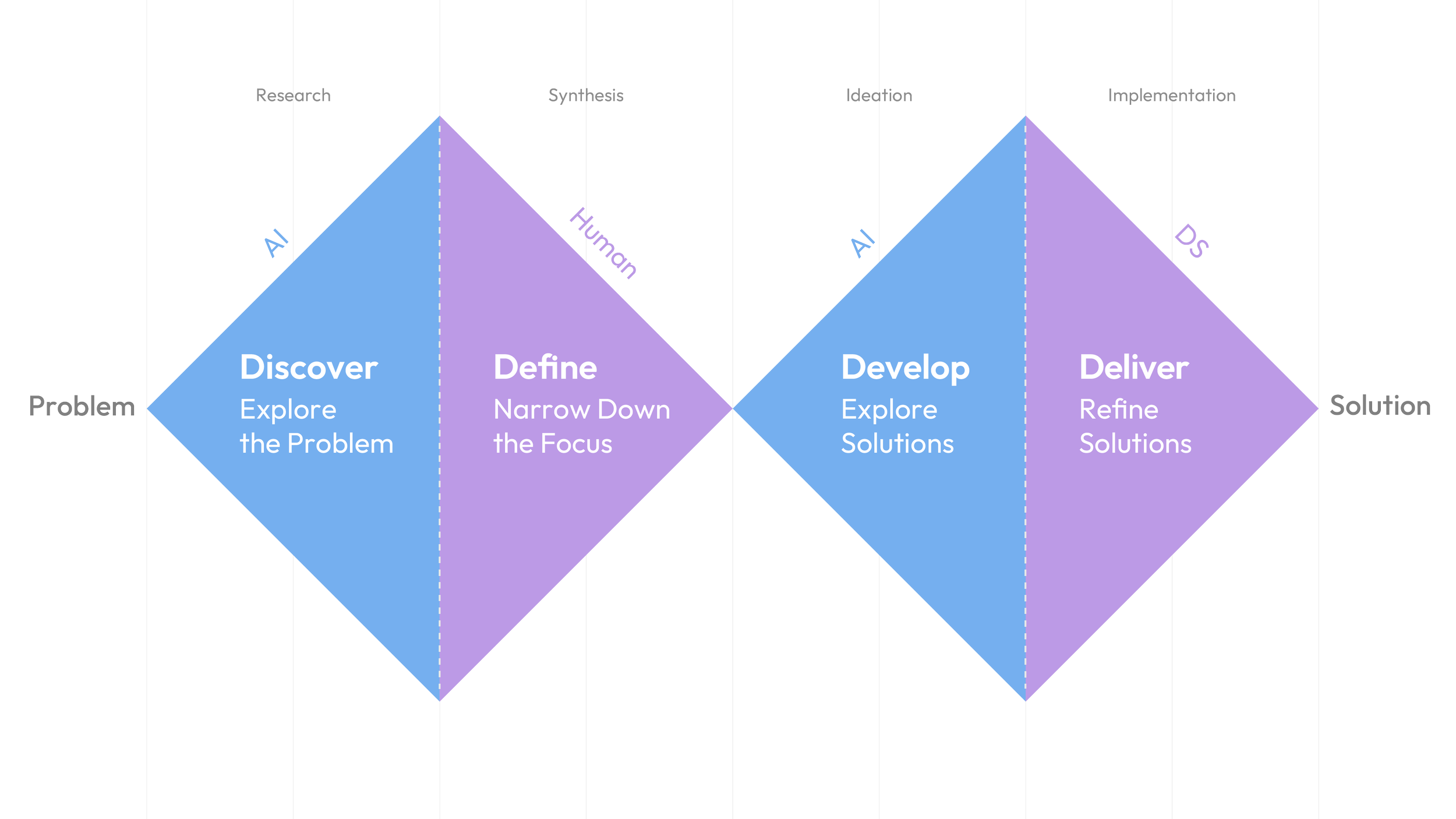 AI Support: AI is applied as a primary strength in the Discover and Develop phases. It supports these stages by exploring numerous solutions derived from multi-variable information.